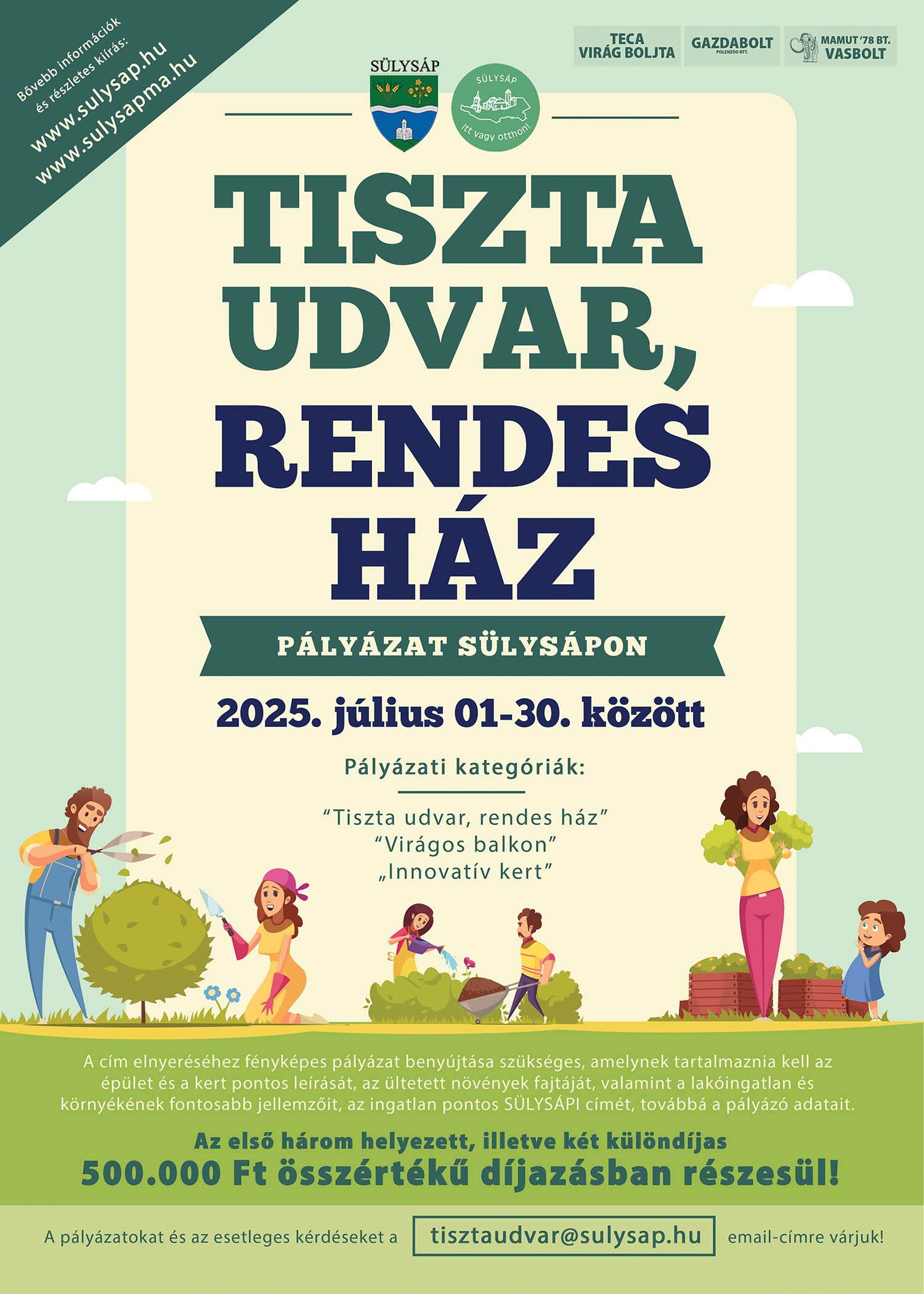 A pályázatokat a tisztaudvar@sulysap.hu email-címre várjuk!