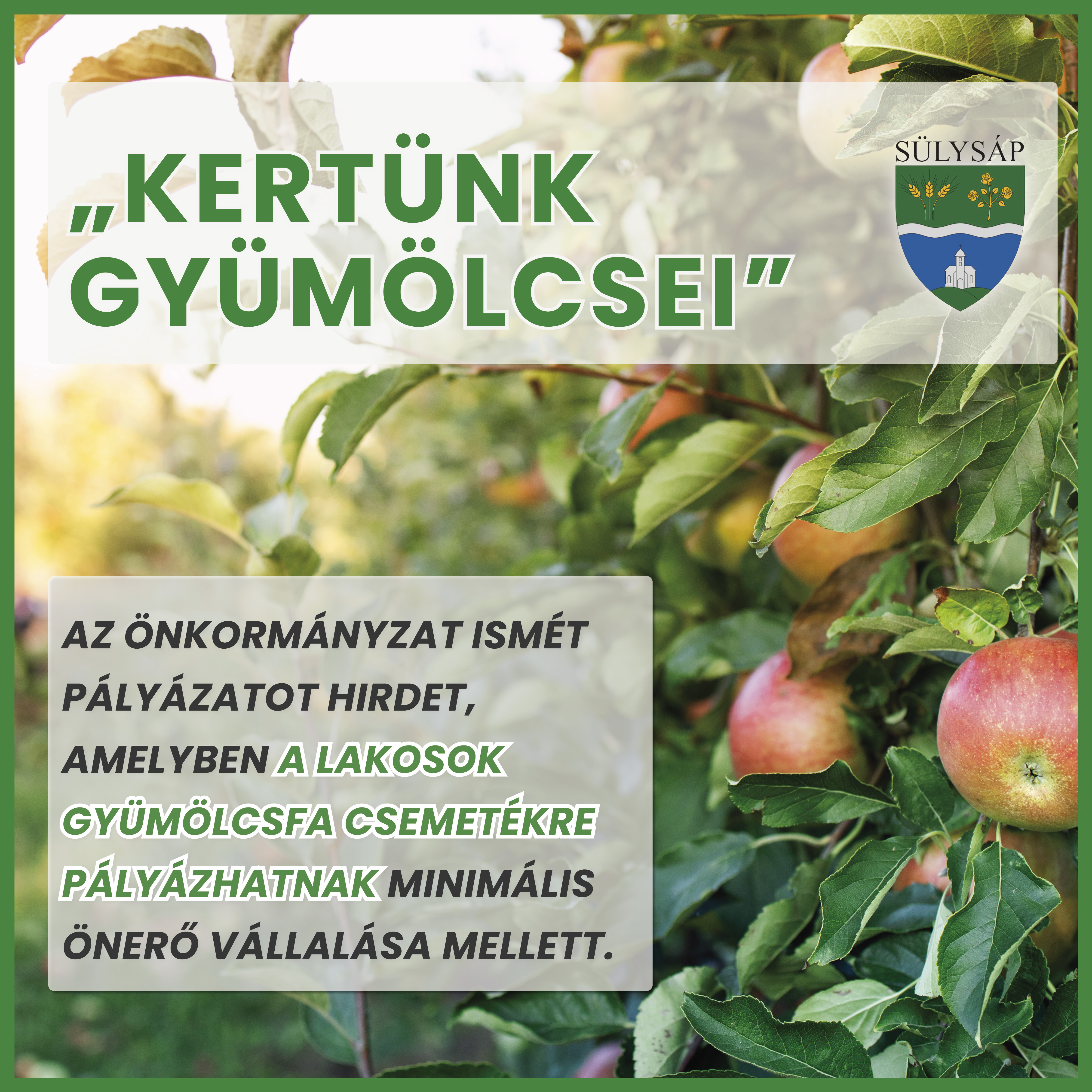 Aktuális célunk a település zöldfelületeinek növelése, ennek érdekében „Kertünk gyümölcsei” címmel, gyümölcsfa csemete pályázatot hirdetünk a sülysápi lakosok számára.
